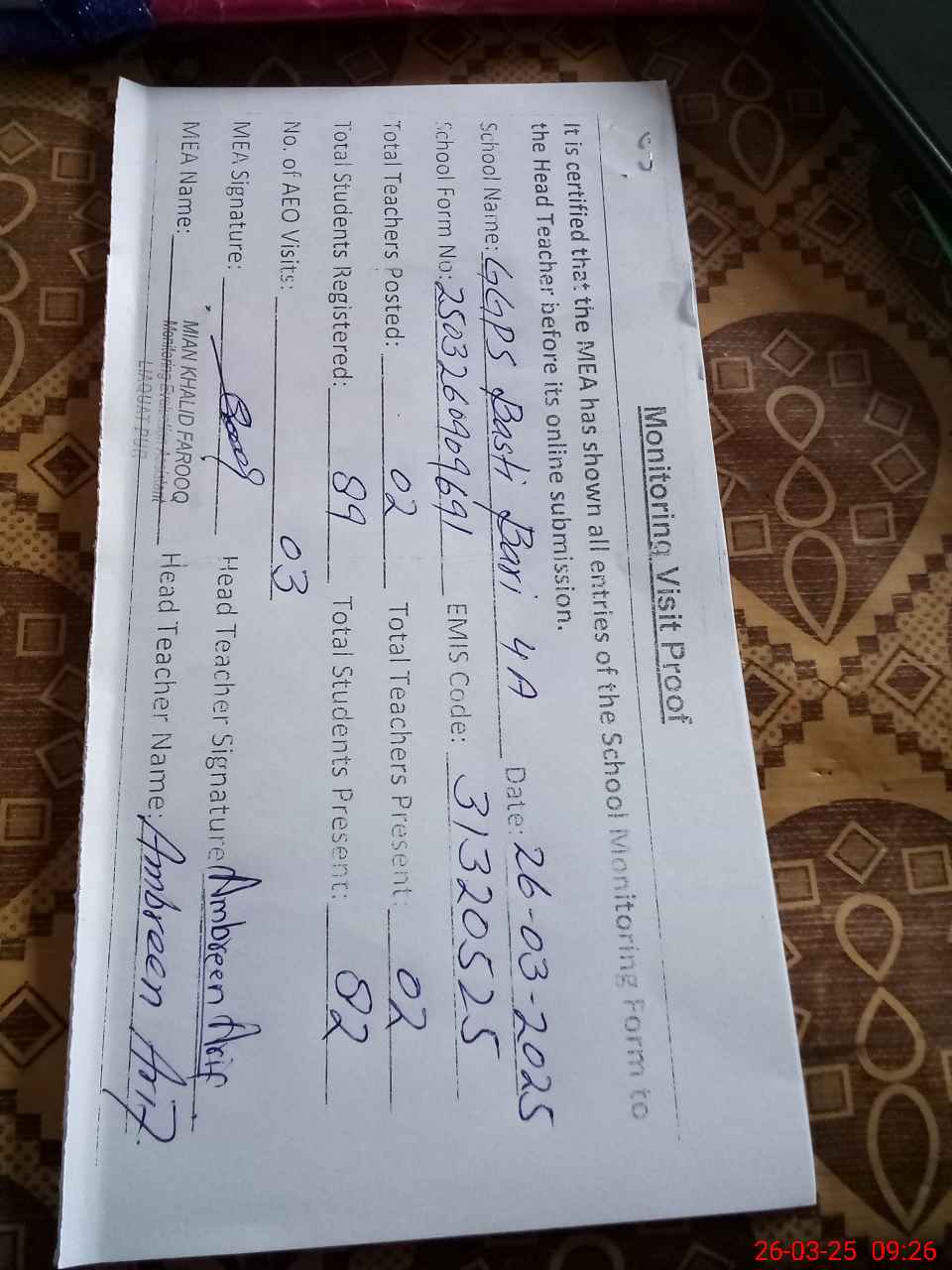 | Attendance Register | Head Teacher | MEA with School | Visit Proof |