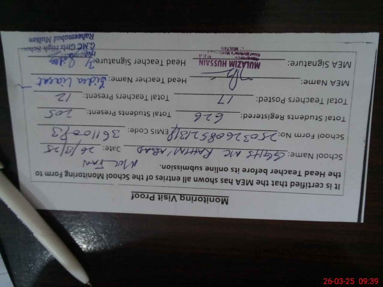 | Certified that this School was Inspected by the Undersigned MEA/DMO Today and the Information Stated Above is as Per Record. | |||||