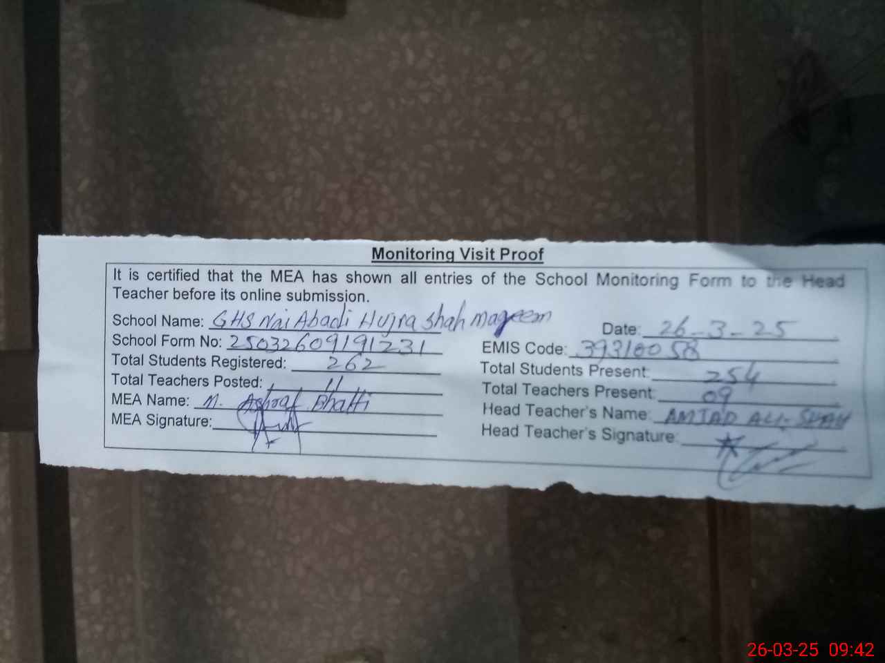 | EMIS Code: 39310058 | Name of School: GHS NAI ABADI HUJRA SHAH MUQEEM | |||