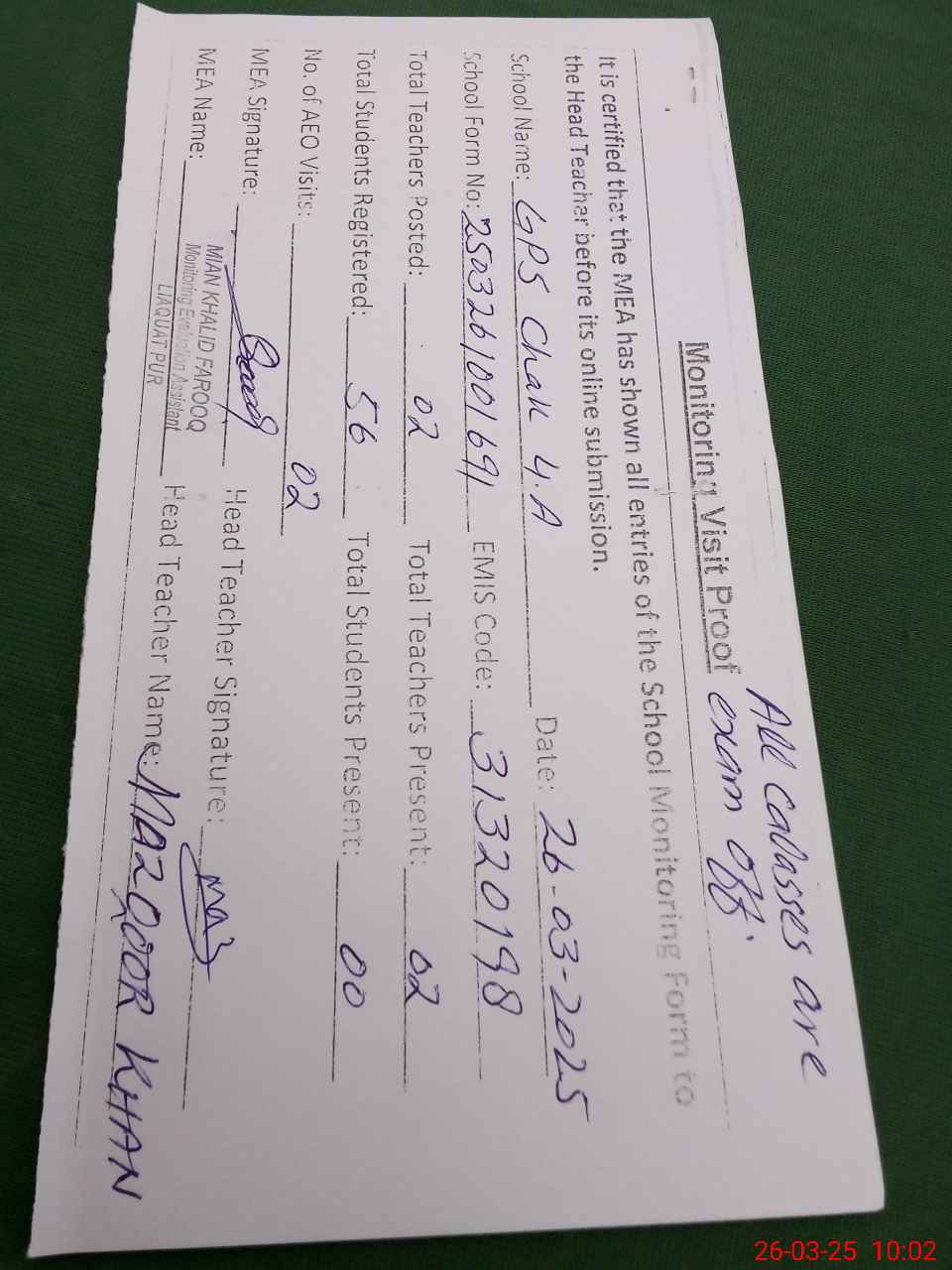 | Attendance Register | Head Teacher | MEA with School | Visit Proof |