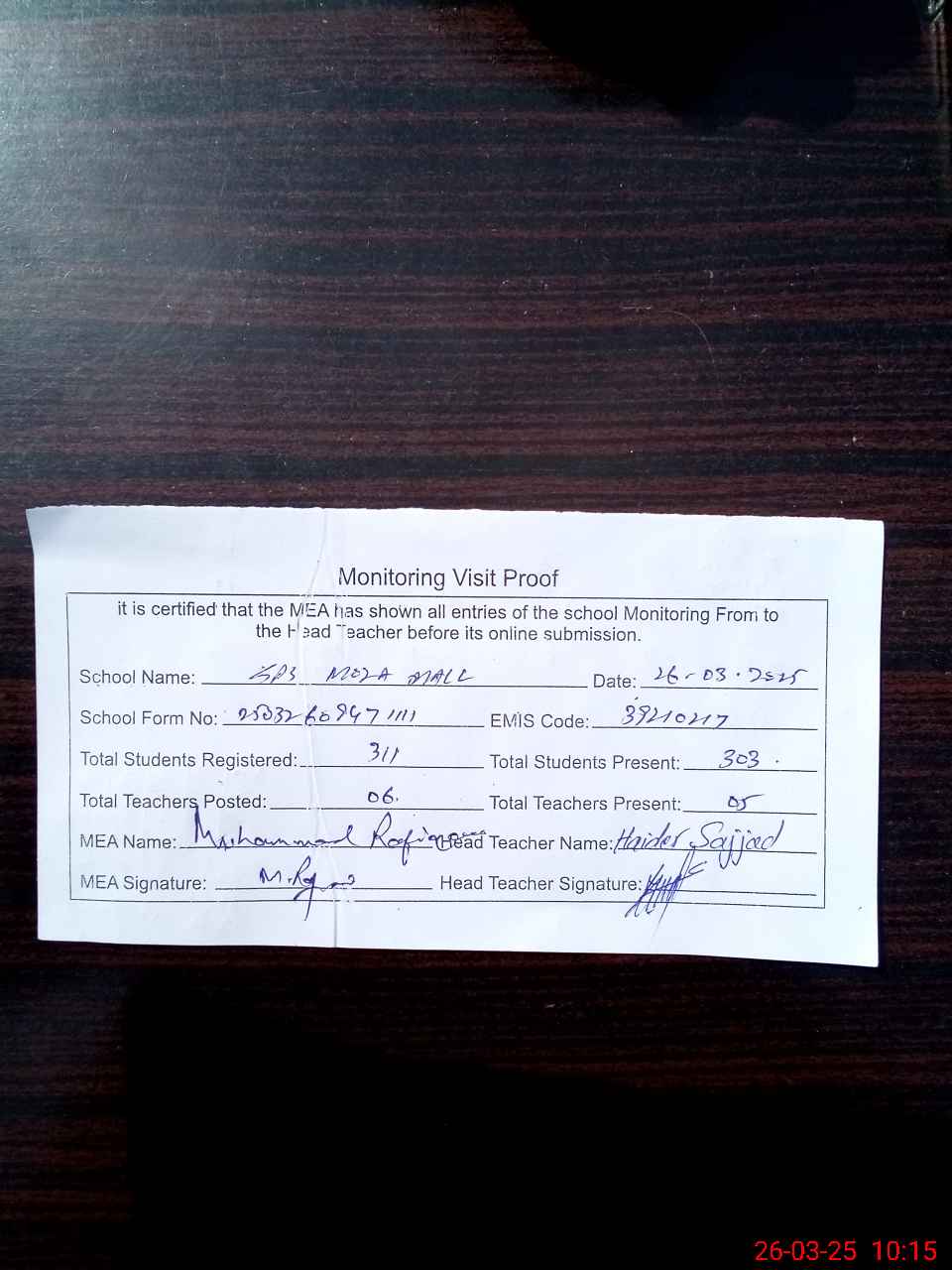 | Certified that this School was Inspected by the Undersigned MEA/DMO Today and the Information Stated Above is as Per Record. | |||||