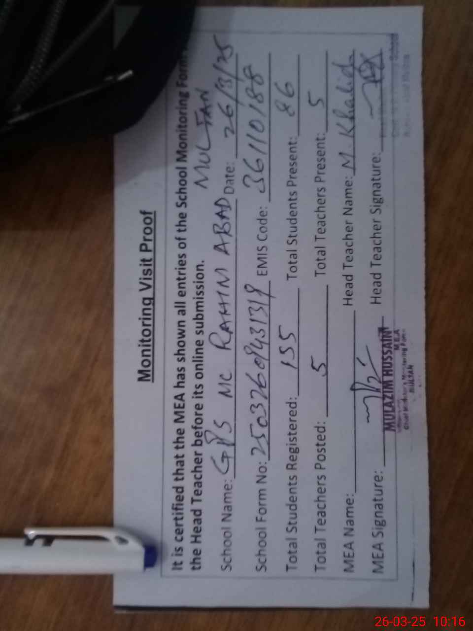 | EMIS Code: 36110188 | Name of School: GPS MC RAHIMABAD MULTAN | |||