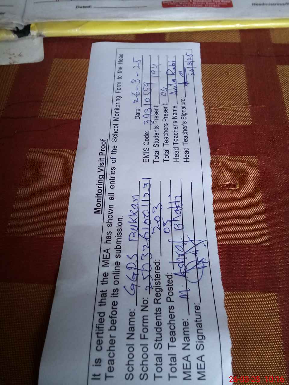 | Certified that this School was Inspected by the Undersigned MEA/DMO Today and the Information Stated Above is as Per Record. | |||||