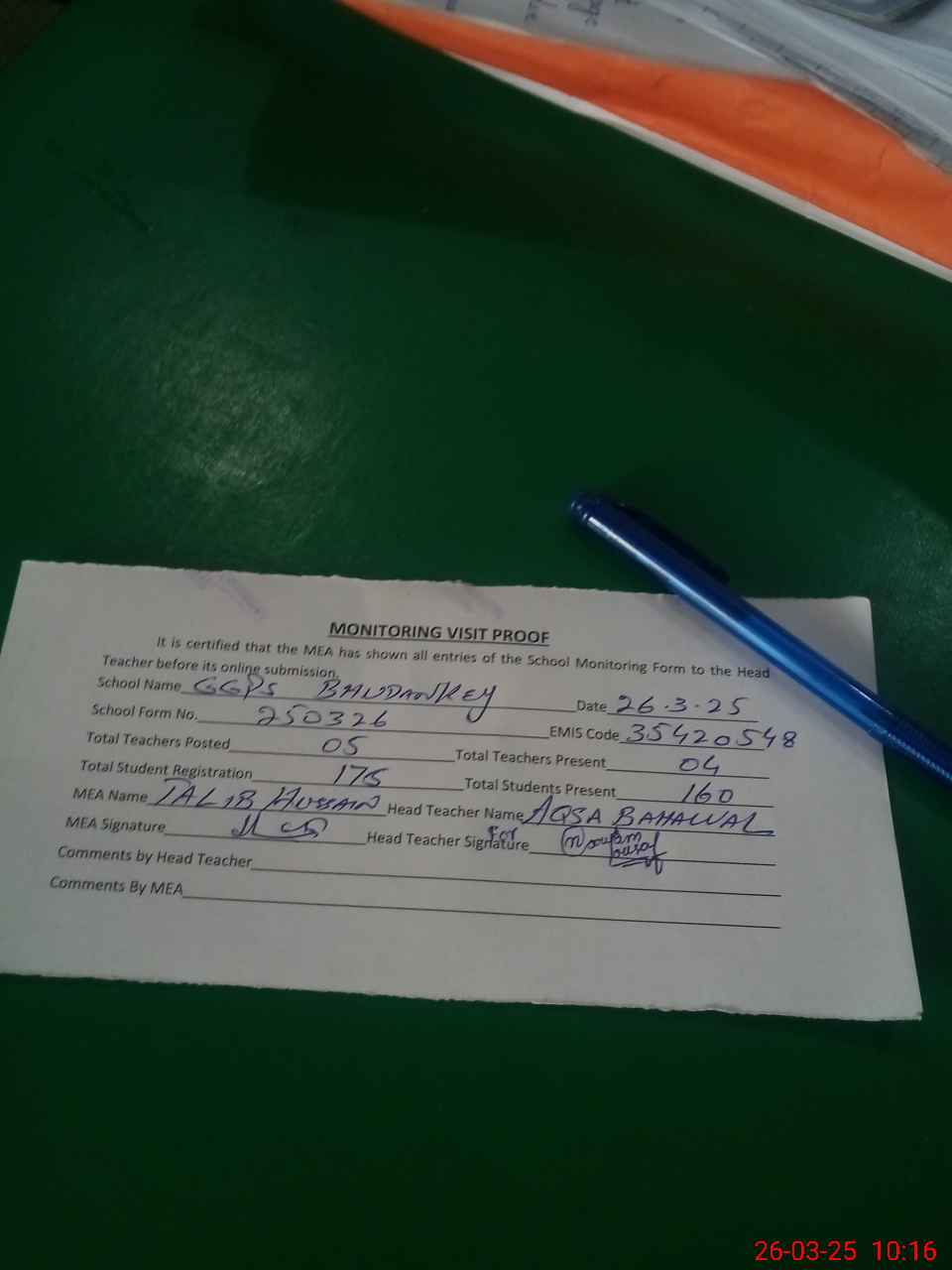 | Attendance Register | Head Teacher | MEA with School | Visit Proof |