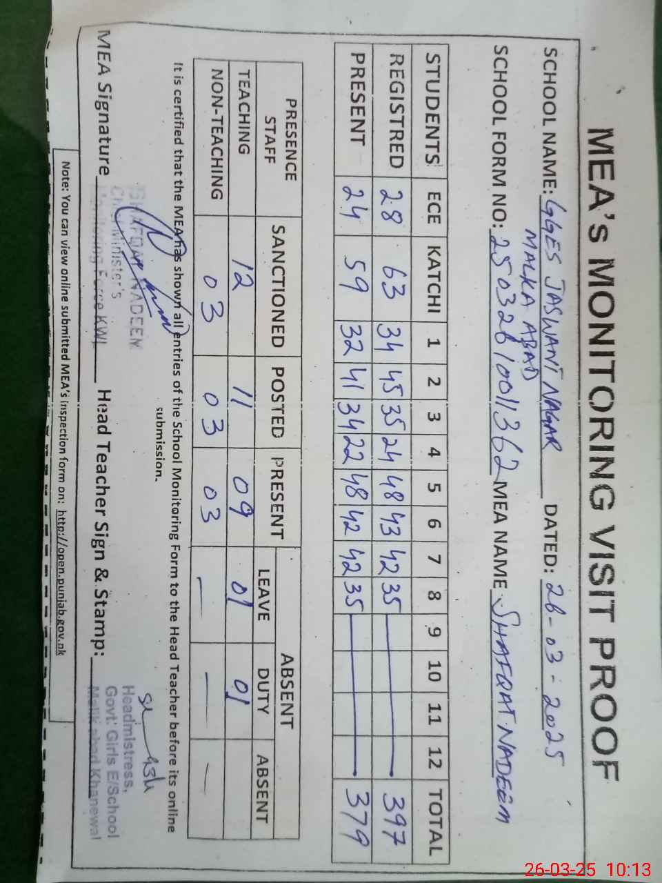| Attendance Register | Head Teacher | MEA with School | Visit Proof |