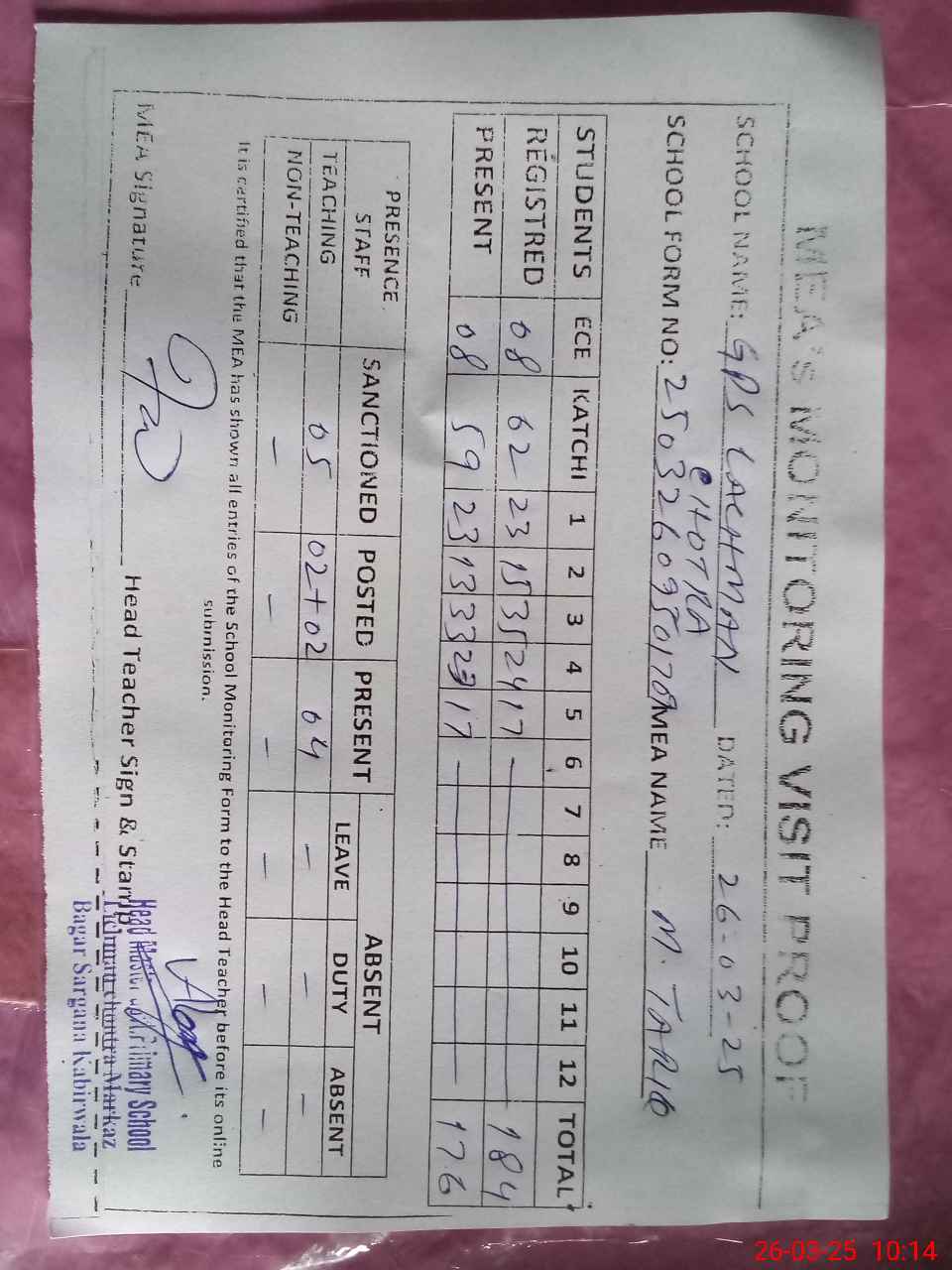 | Attendance Register | Head Teacher | MEA with School | Visit Proof |