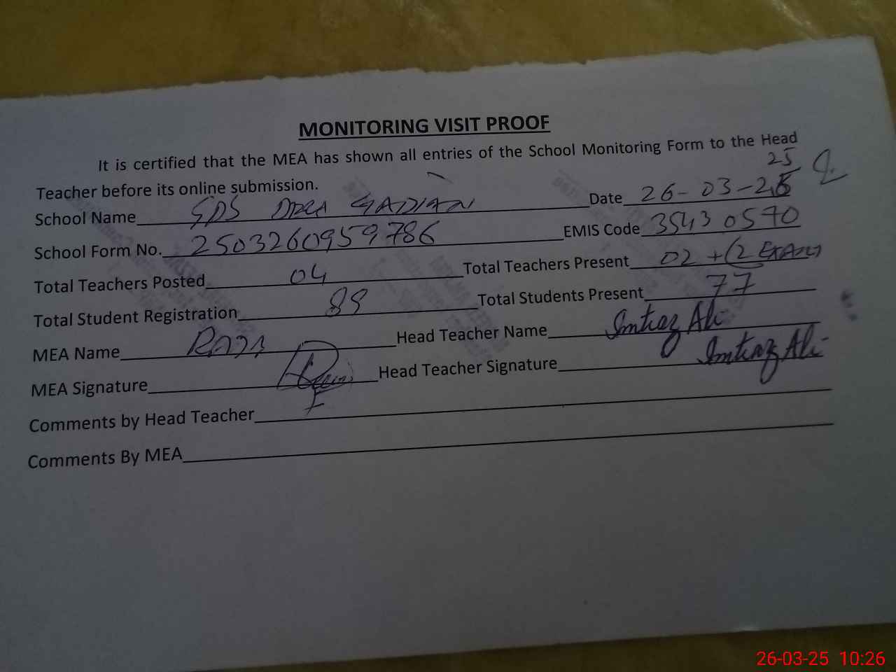 | Attendance Register | Head Teacher | MEA with School | Visit Proof |