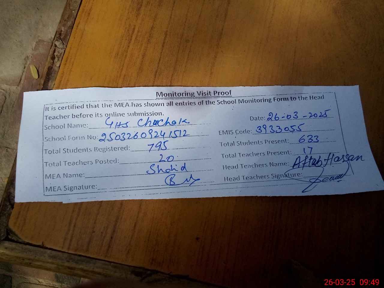 | Certified that this School was Inspected by the Undersigned MEA/DMO Today and the Information Stated Above is as Per Record. | |||||