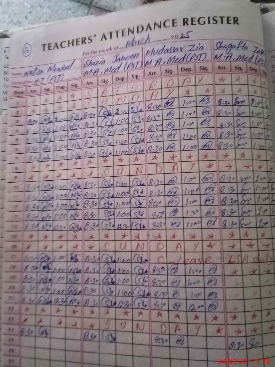 | CNIC | Full Name | Designation | R/C | Absence During Last Calender Month |