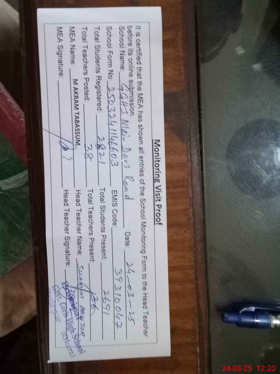 | Attendance Register | Head Teacher | MEA with School | Visit Proof |