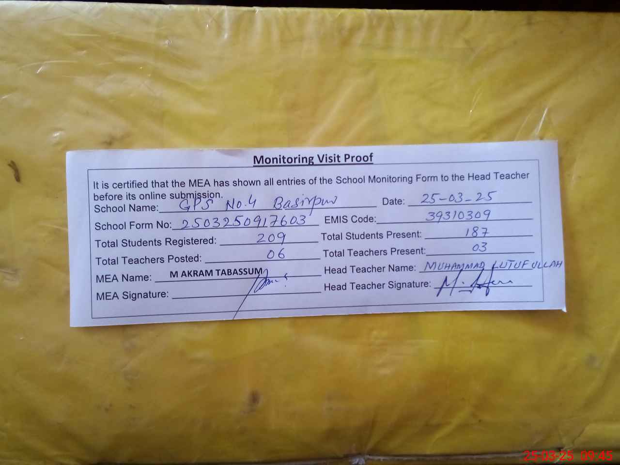 | EMIS Code: 39310309 | Name of School: GPS NO. 4 BASIR PUR | |||