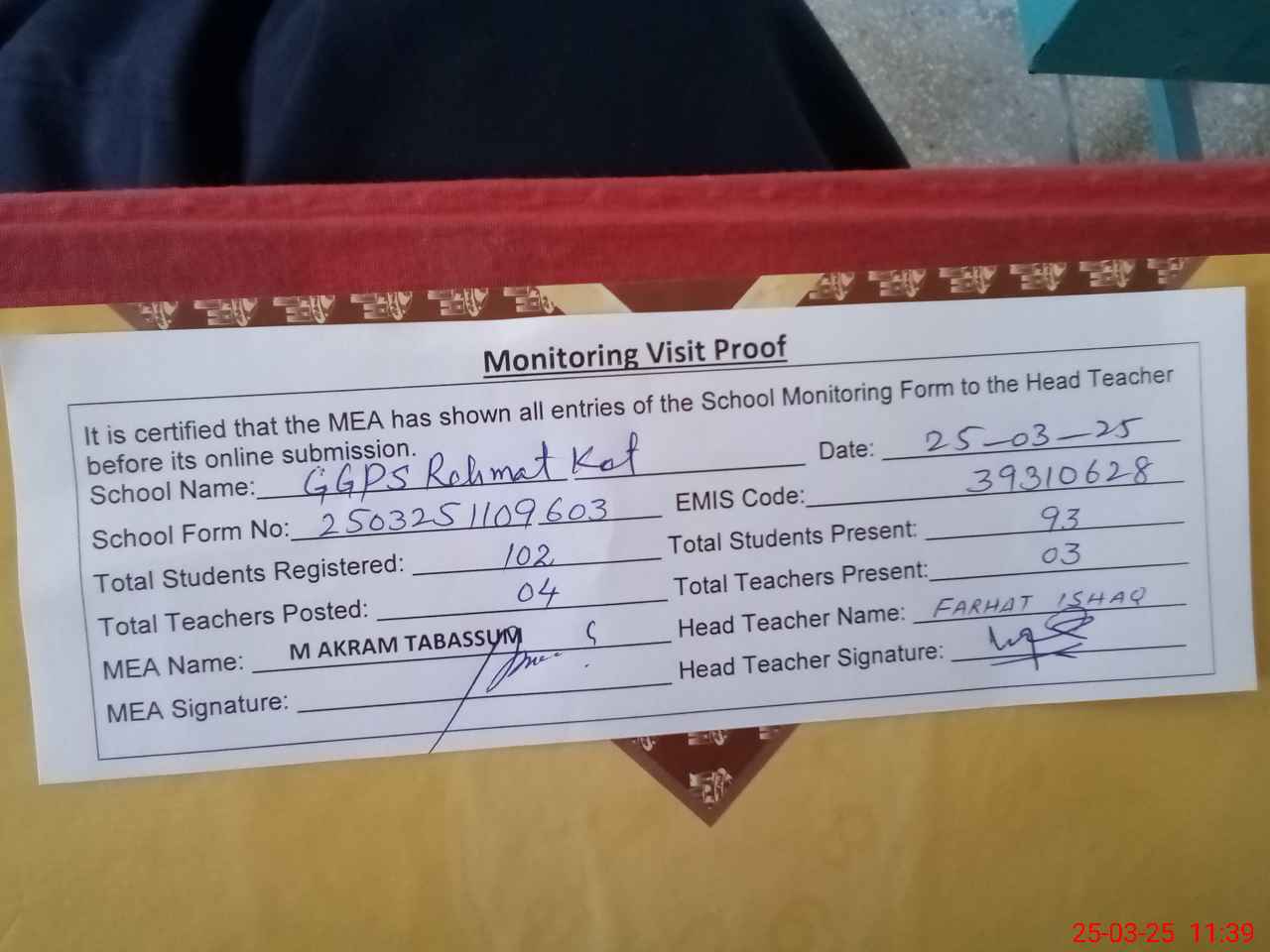 | EMIS Code: 39310628 | Name of School: GGPS REHMAT KOT | |||