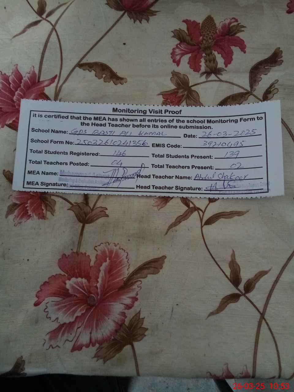 | Attendance Register | Head Teacher | MEA with School | Visit Proof |