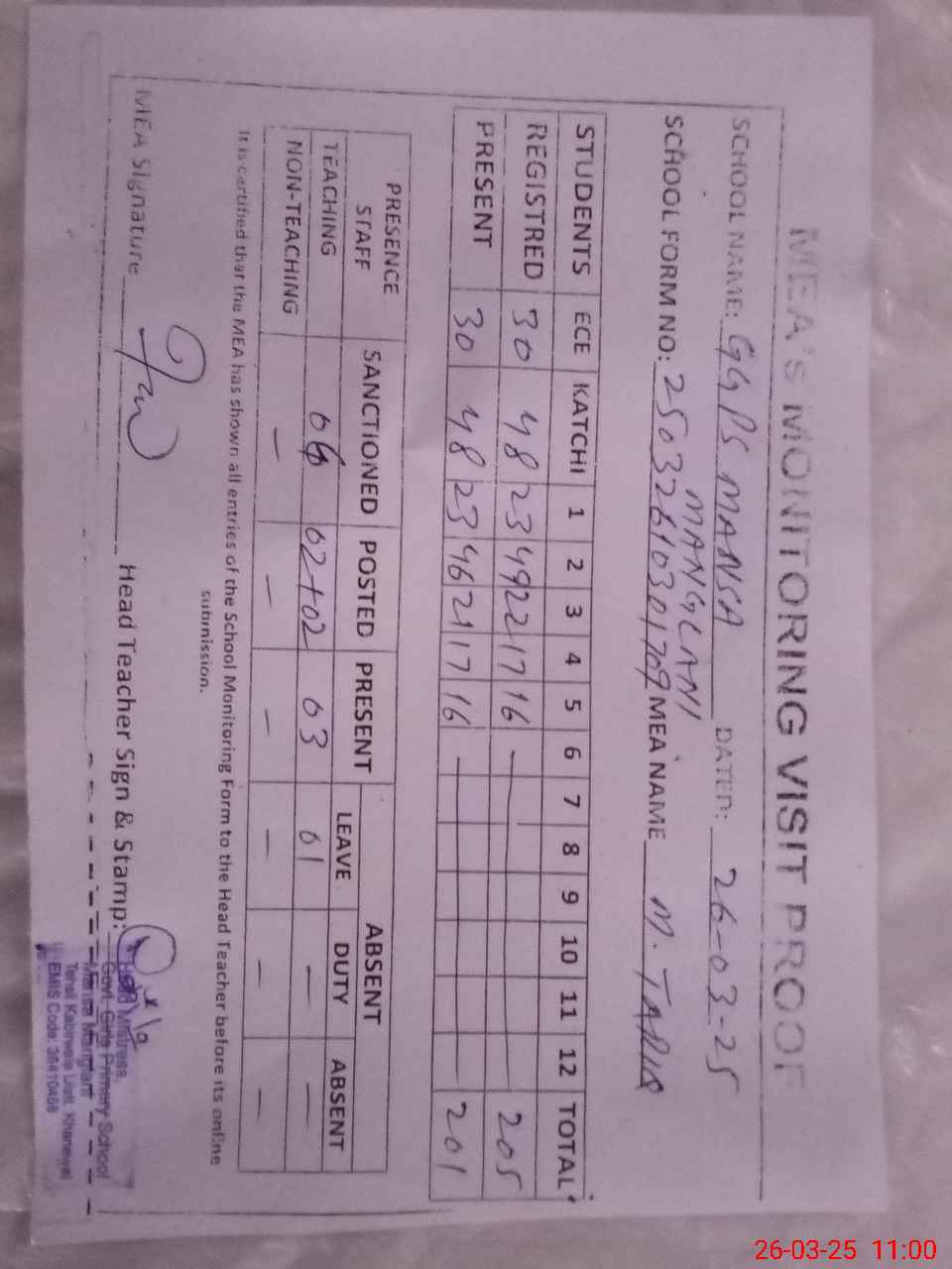 | Attendance Register | Head Teacher | MEA with School | Visit Proof |