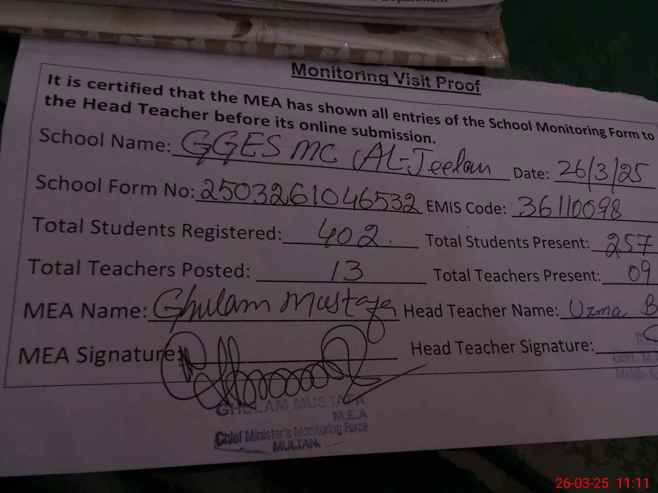 | EMIS Code: 36110098 | Name of School: GGES MC AL-JEELAN MULTAN | |||