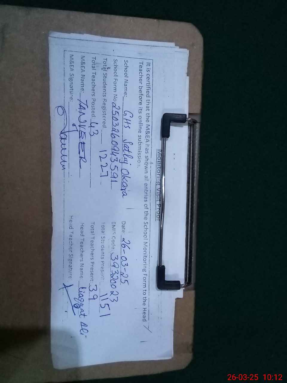 | Certified that this School was Inspected by the Undersigned MEA/DMO Today and the Information Stated Above is as Per Record. | |||||