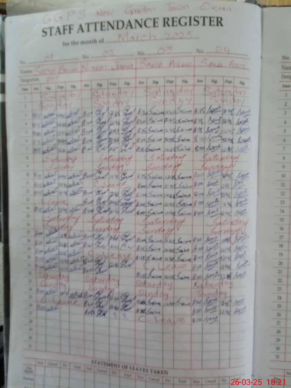 | Leave | Duty | Absent | Maternity | Medical | Ex- Pak |
