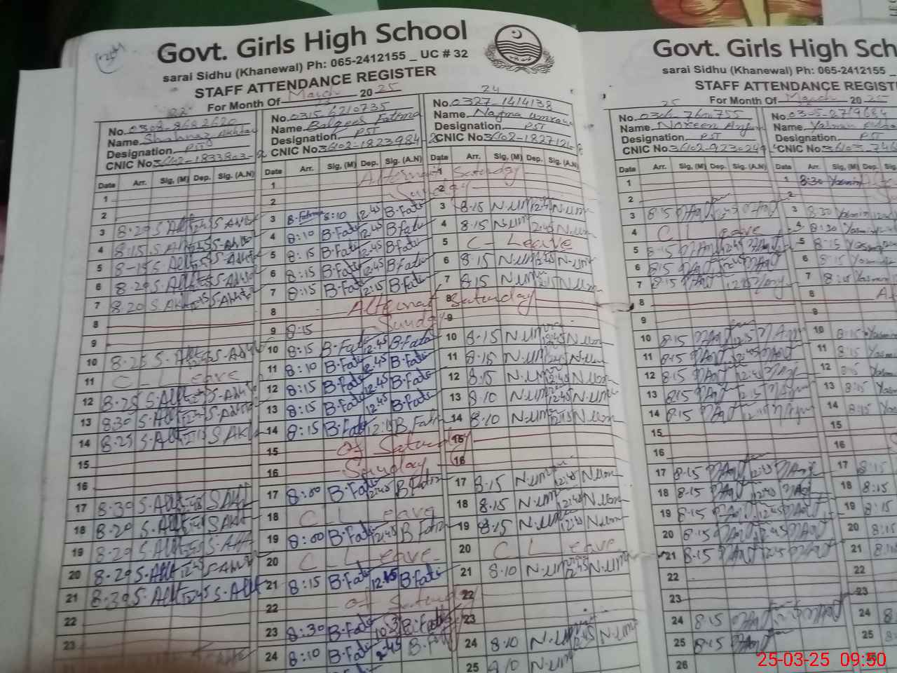 | CNIC | Full Name | Designation | R/C | Absence During Last Calender Month |