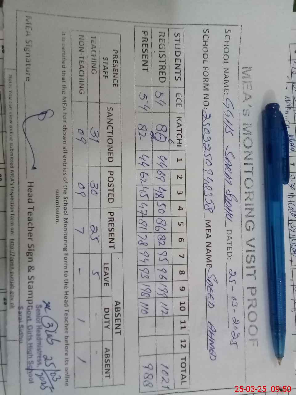 | Attendance Register | Head Teacher | MEA with School | Visit Proof |
