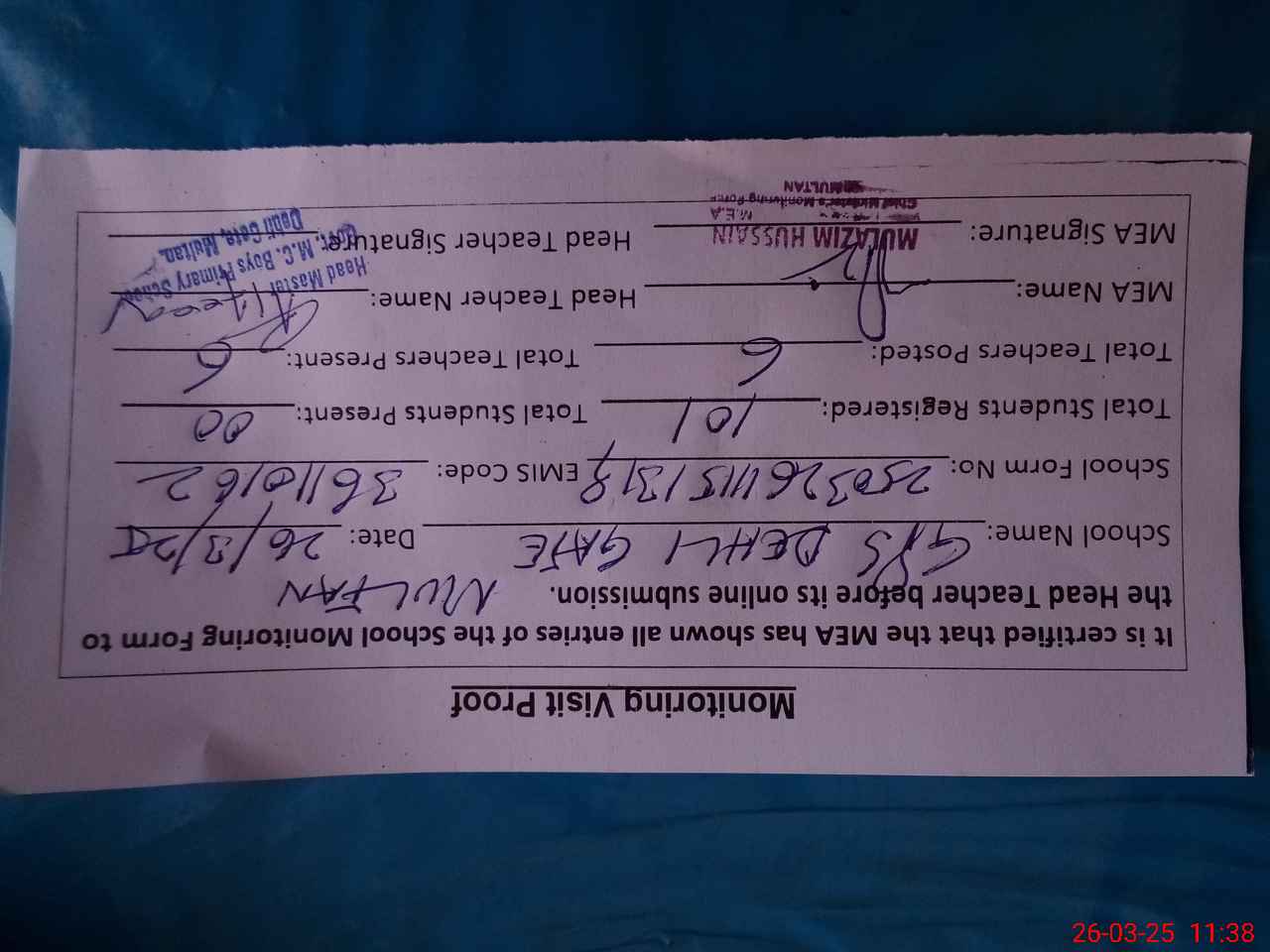 | Attendance Register | Head Teacher | MEA with School | Visit Proof |