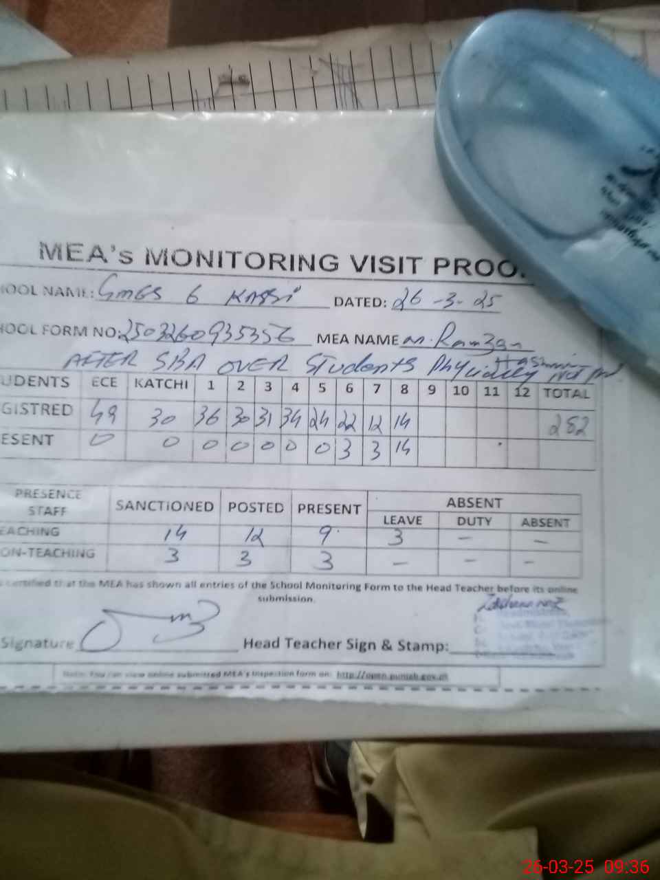 | Attendance Register | Head Teacher | MEA with School | Visit Proof |