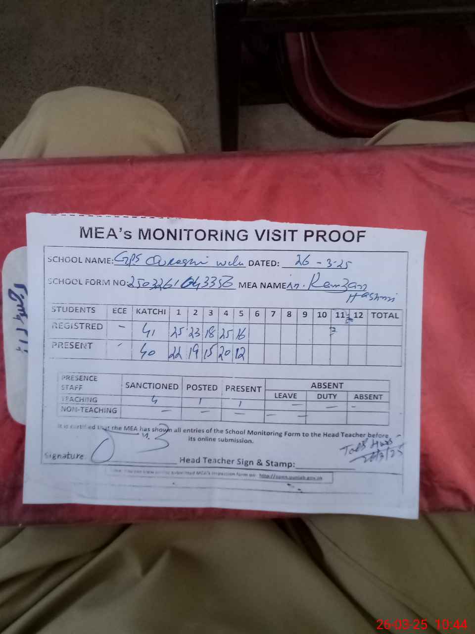 | Attendance Register | Head Teacher | MEA with School | Visit Proof |