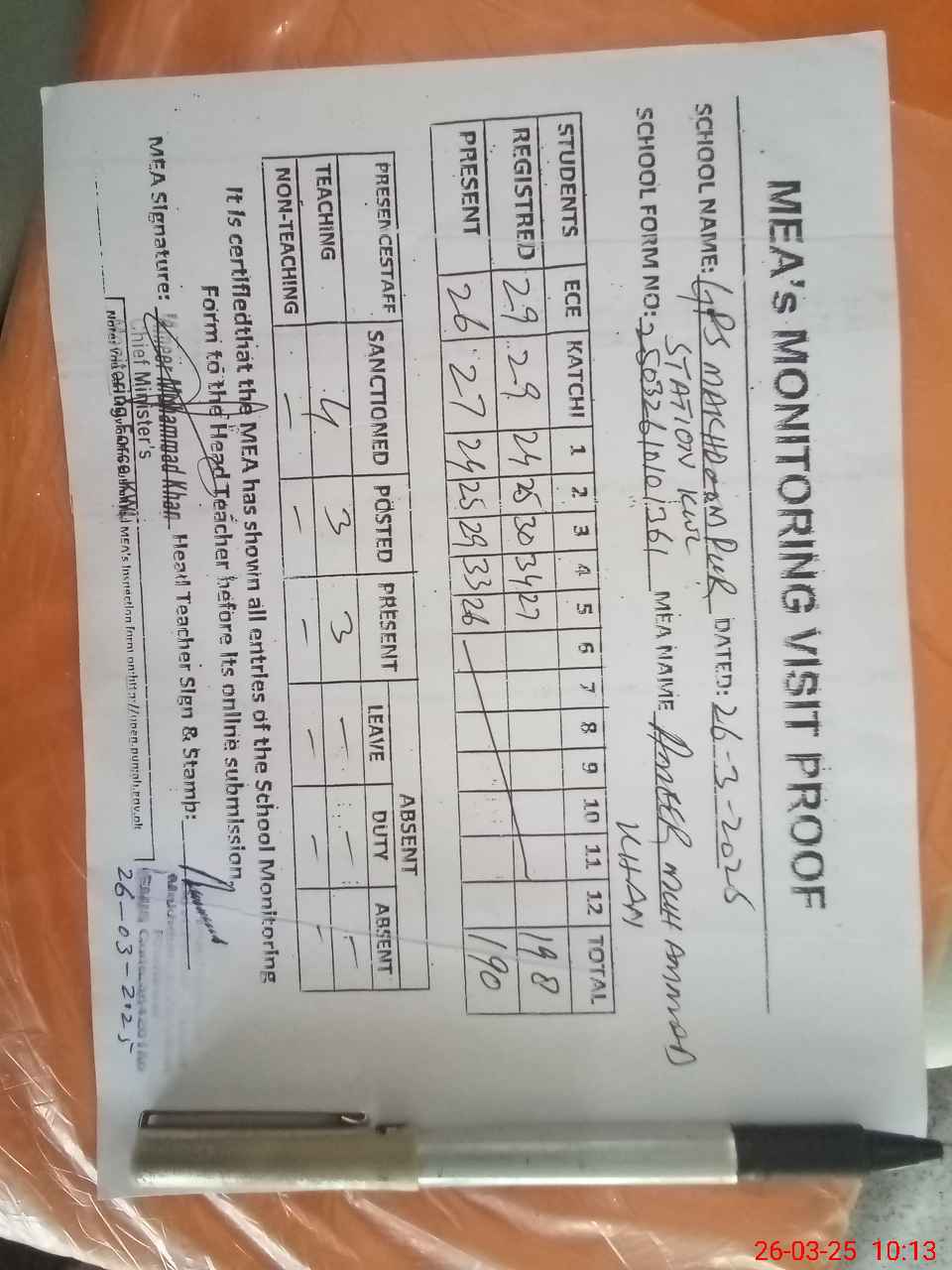 | Attendance Register | Head Teacher | MEA with School | Visit Proof |