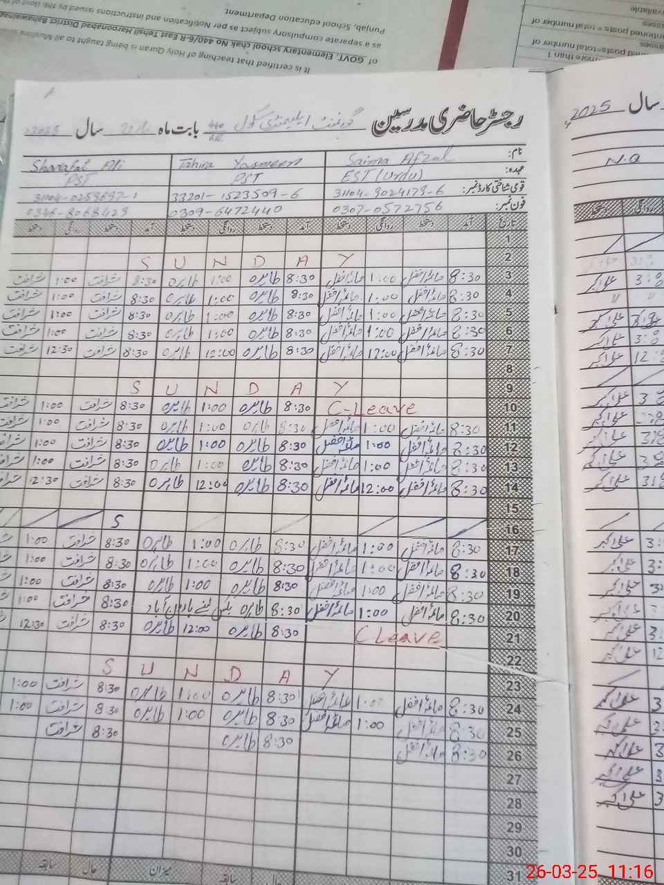 | CNIC | Full Name | Designation | R/C | Absence During Last Calender Month |