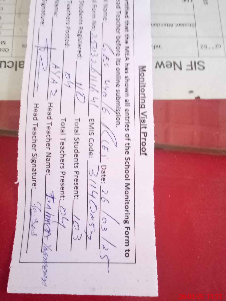 | Attendance Register | Head Teacher | MEA with School | Visit Proof |