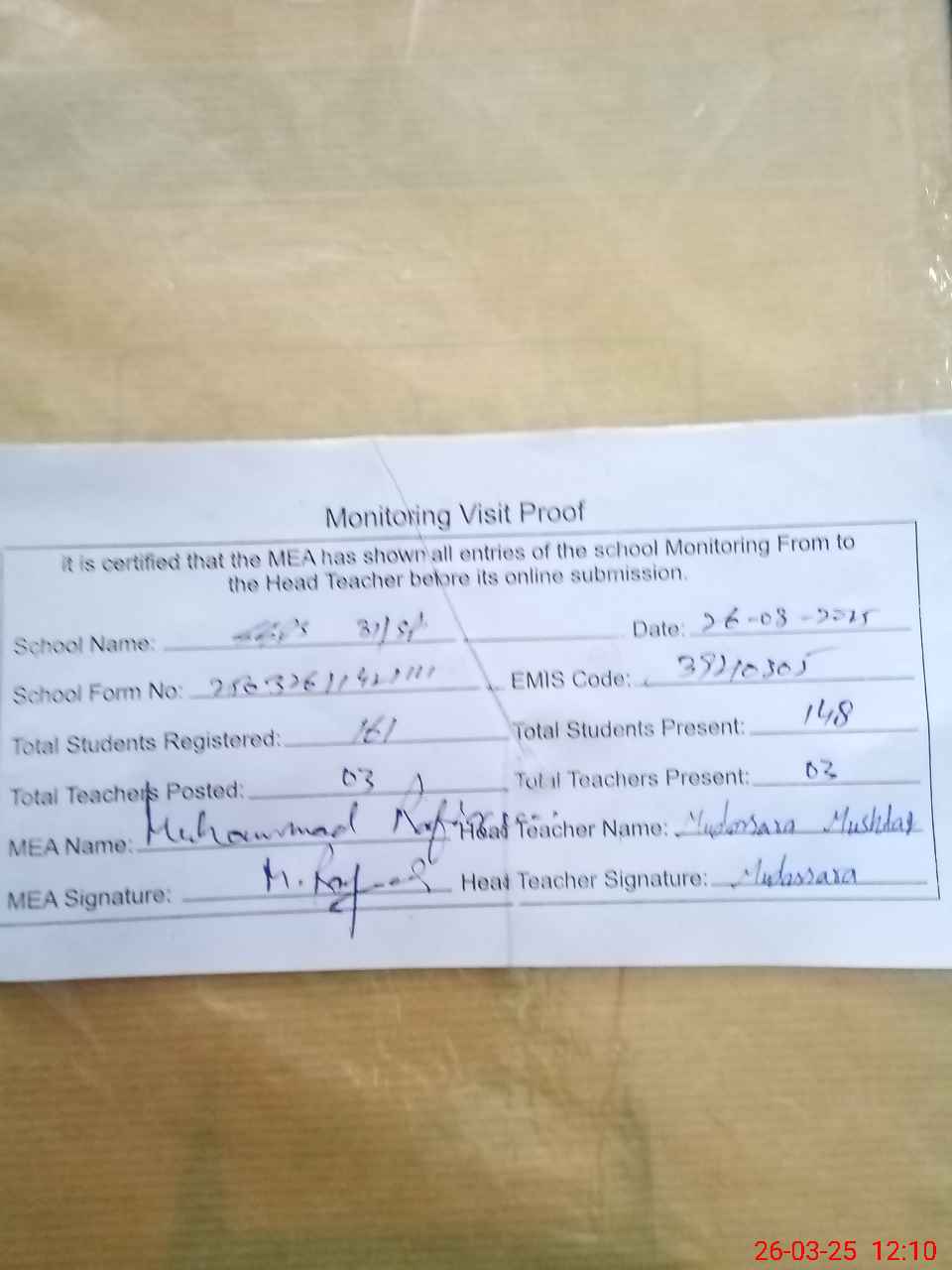| Certified that this School was Inspected by the Undersigned MEA/DMO Today and the Information Stated Above is as Per Record. | |||||