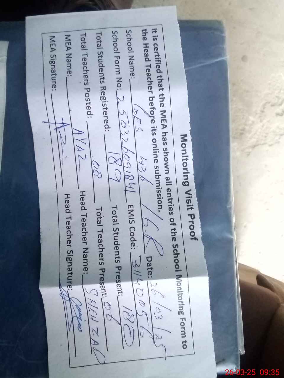 | Attendance Register | Head Teacher | MEA with School | Visit Proof |