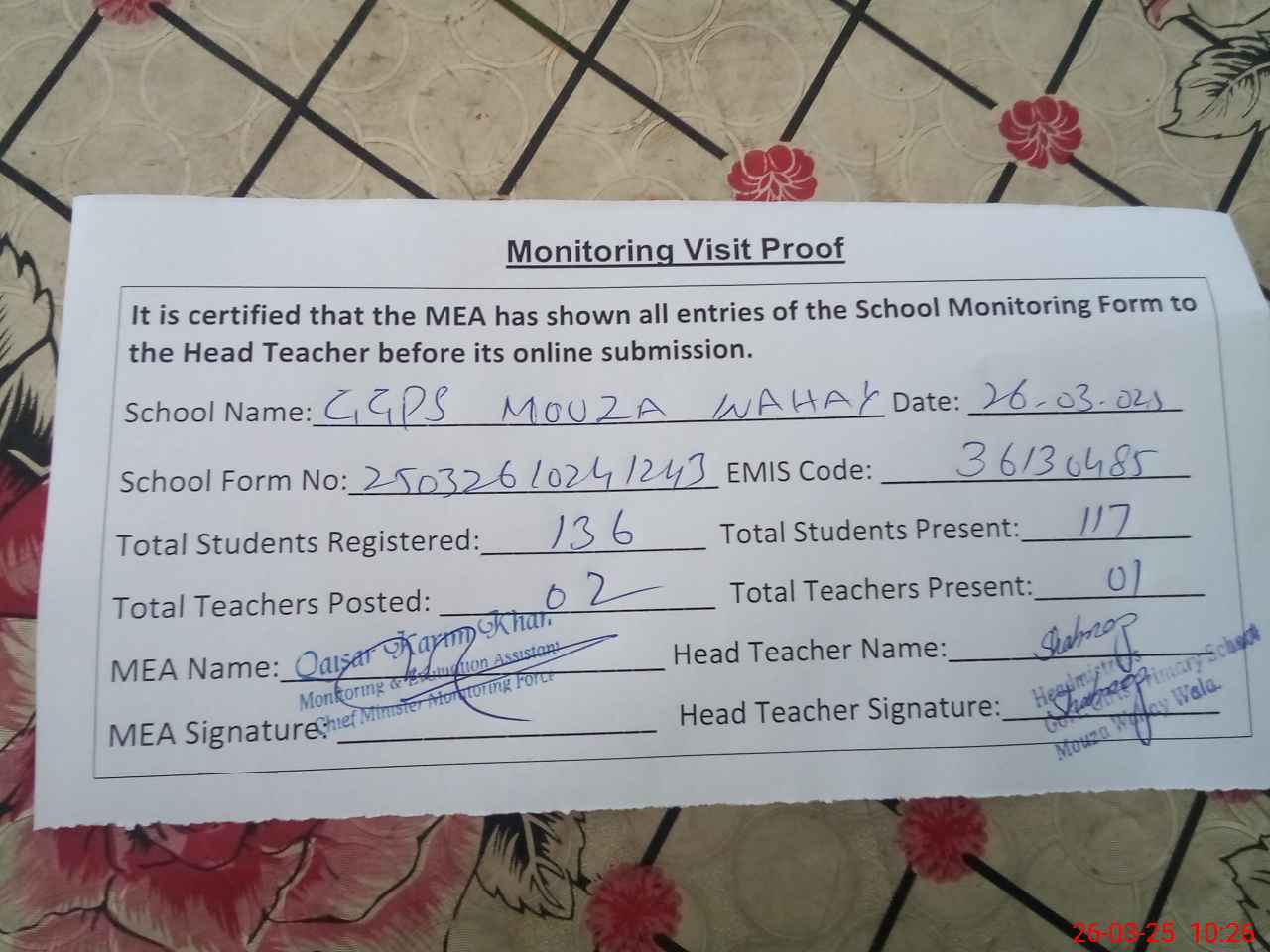 | Attendance Register | Head Teacher | MEA with School | Visit Proof |