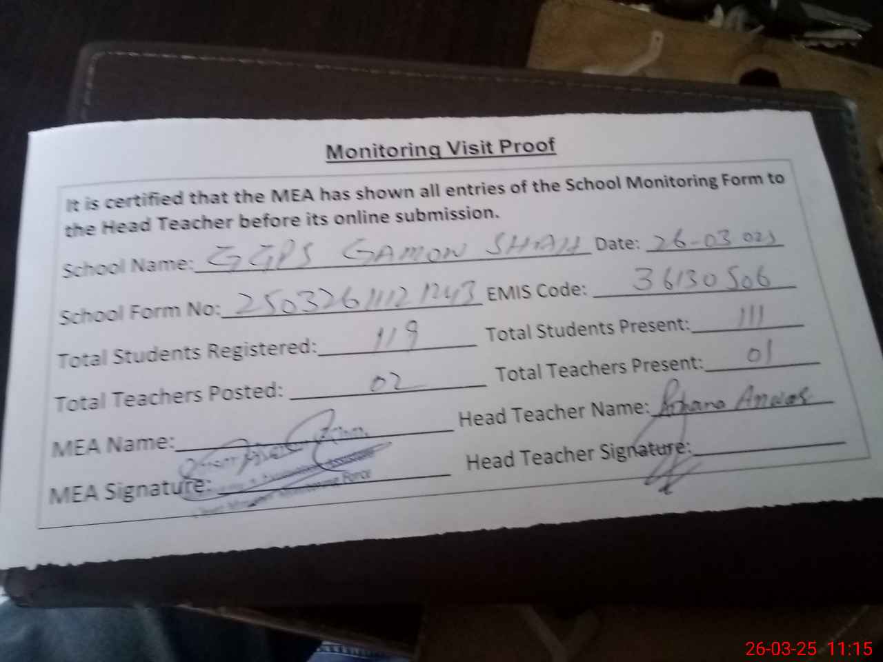 | Attendance Register | Head Teacher | MEA with School | Visit Proof |