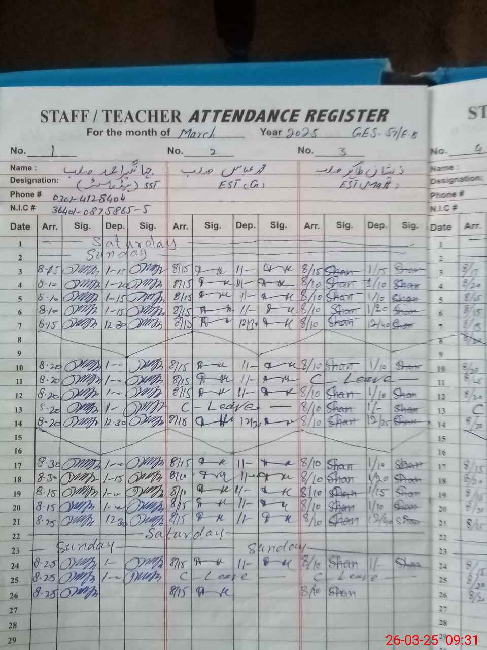 | CNIC | Full Name | Designation | R/C | Absence during last cal. month |