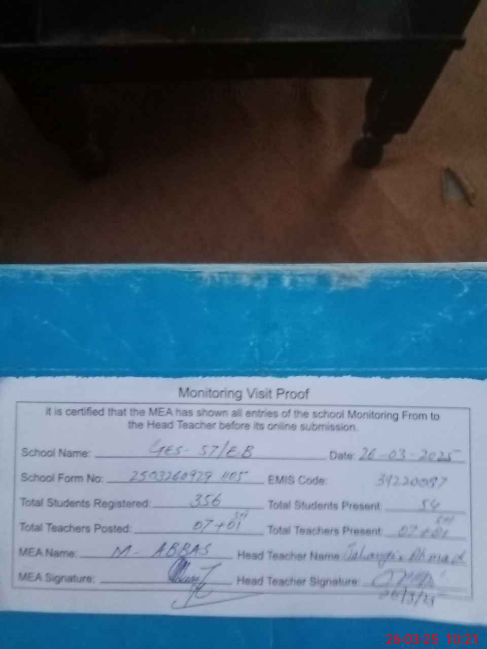 | Attendance Register | Head Teacher | MEA with School | Visit Proof |