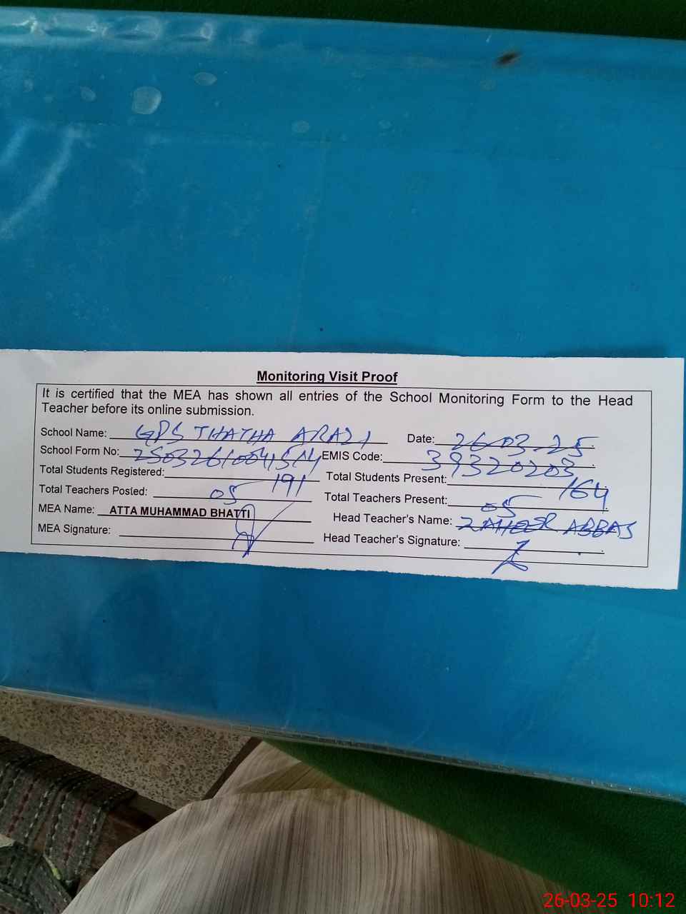 | Attendance Register | Head Teacher | MEA with School | Visit Proof |