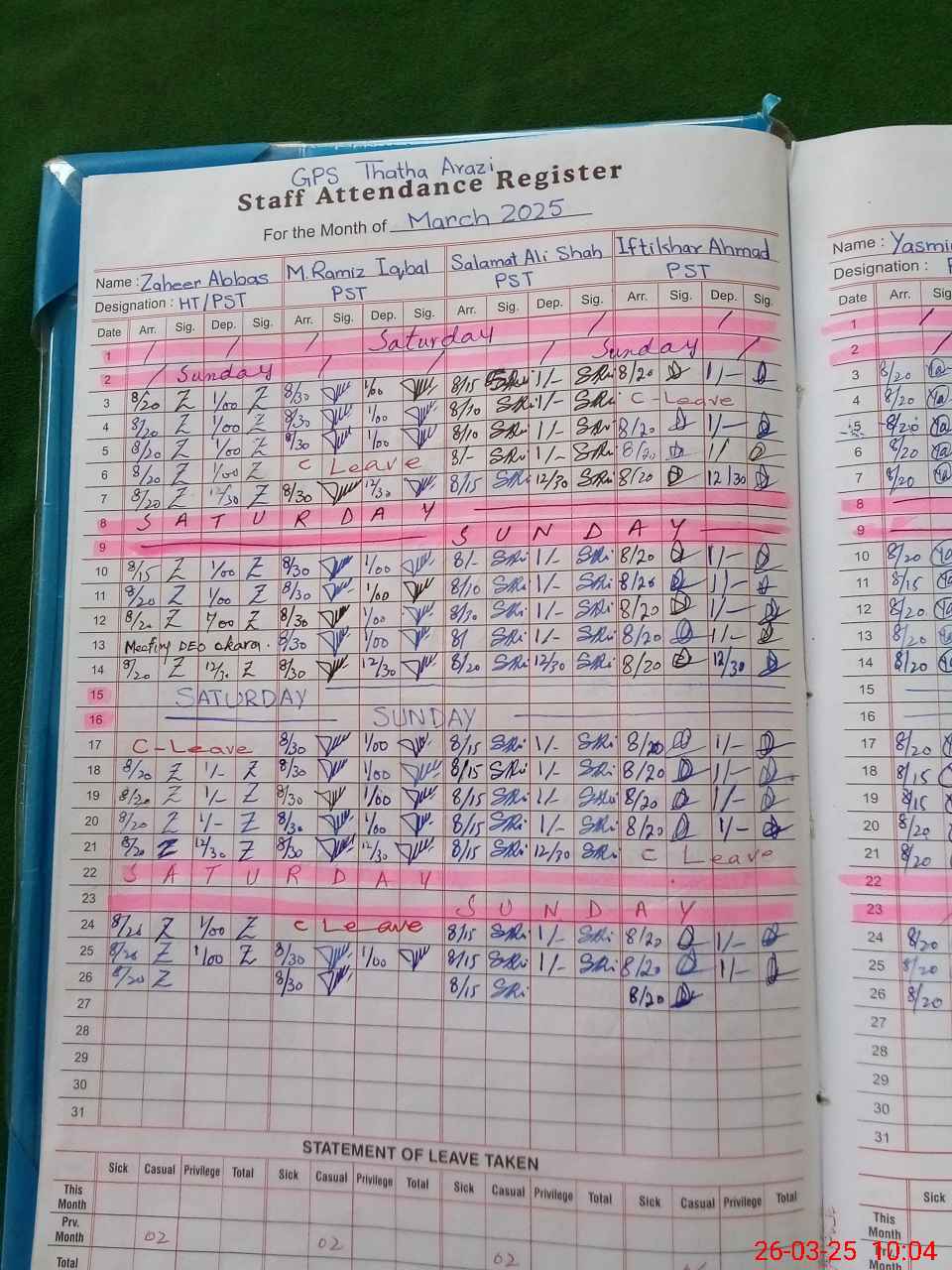 | Leave | Duty | Absent | Maternity | Medical | Ex- Pak |