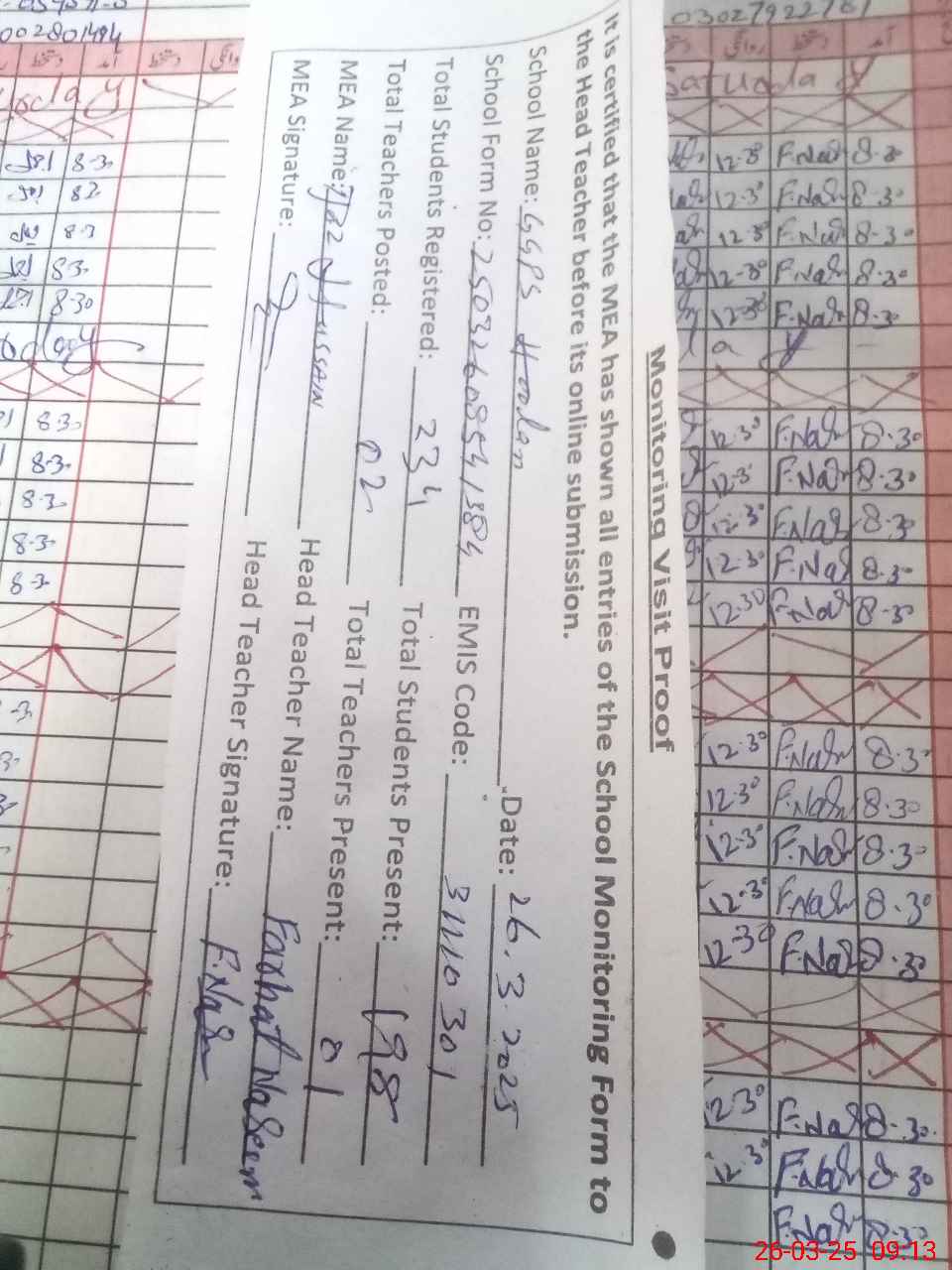 | Attendance Register | Head Teacher | MEA with School | Visit Proof |