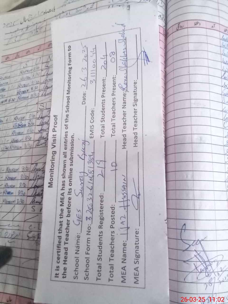 | Attendance Register | Head Teacher | MEA with School | Visit Proof |
