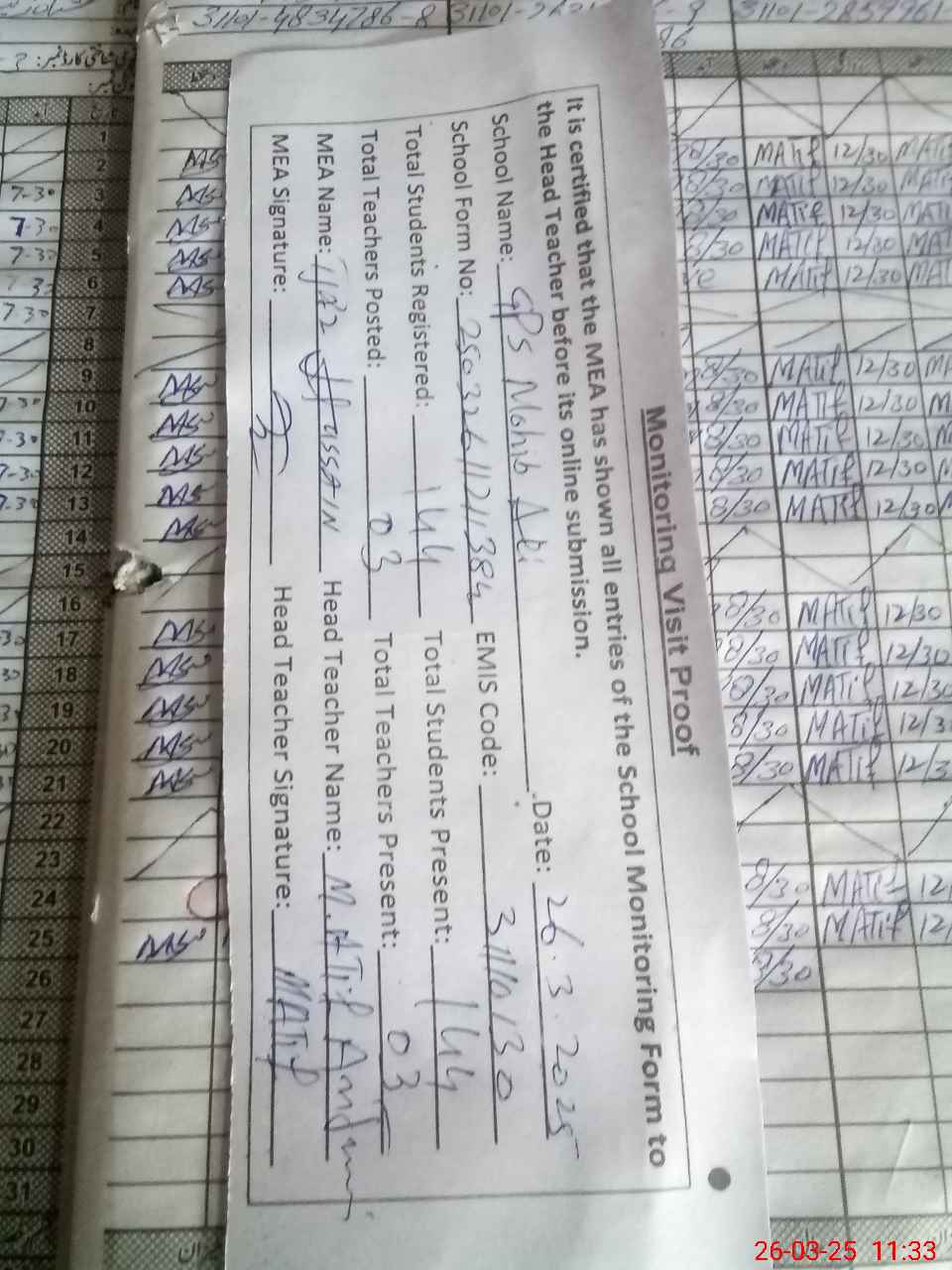 | Attendance Register | Head Teacher | MEA with School | Visit Proof |