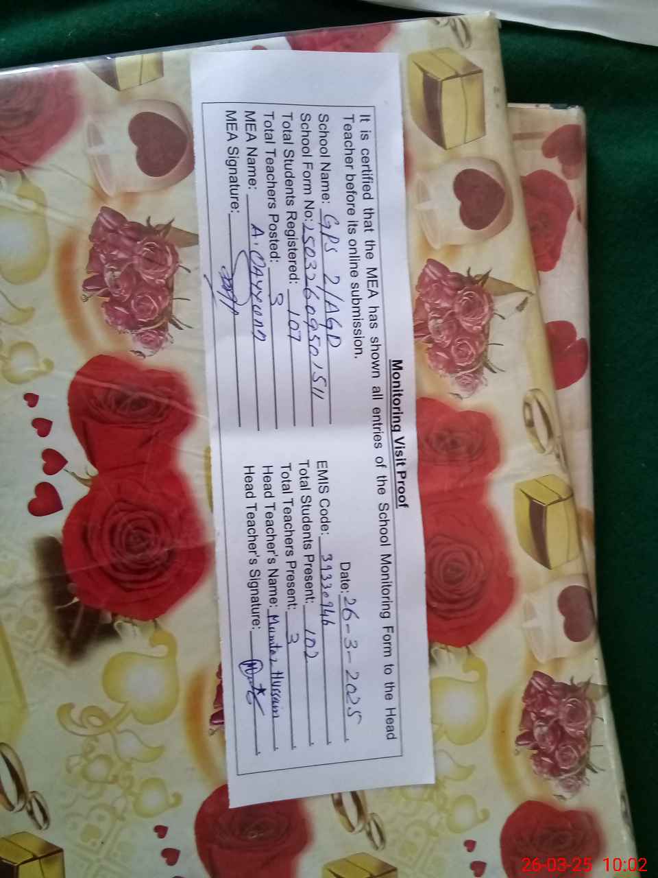 | Certified that this School was Inspected by the Undersigned MEA/DMO Today and the Information Stated Above is as Per Record. | |||||