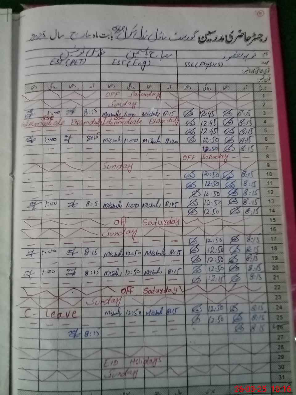 | 31**** | Mi**** Ya**** | EST | Regular | 0 | 0 | 0 | 0 | 0 | 0 | 0 | 0 | 0 | Exam Duty |