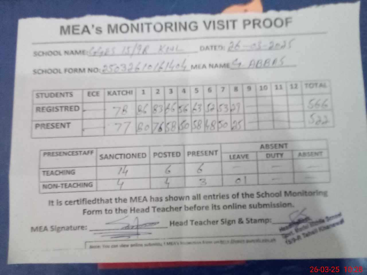 | Attendance Register | Head Teacher | MEA with School | Visit Proof |
