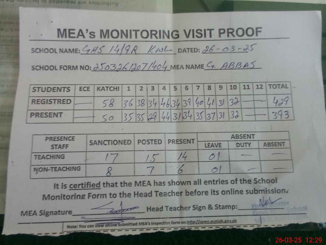 | Attendance Register | Head Teacher | MEA with School | Visit Proof |