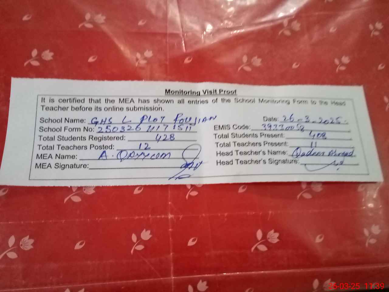 | EMIS Code: 39330058 | Name of School: GHS L PLOT FOUJIAN | |||