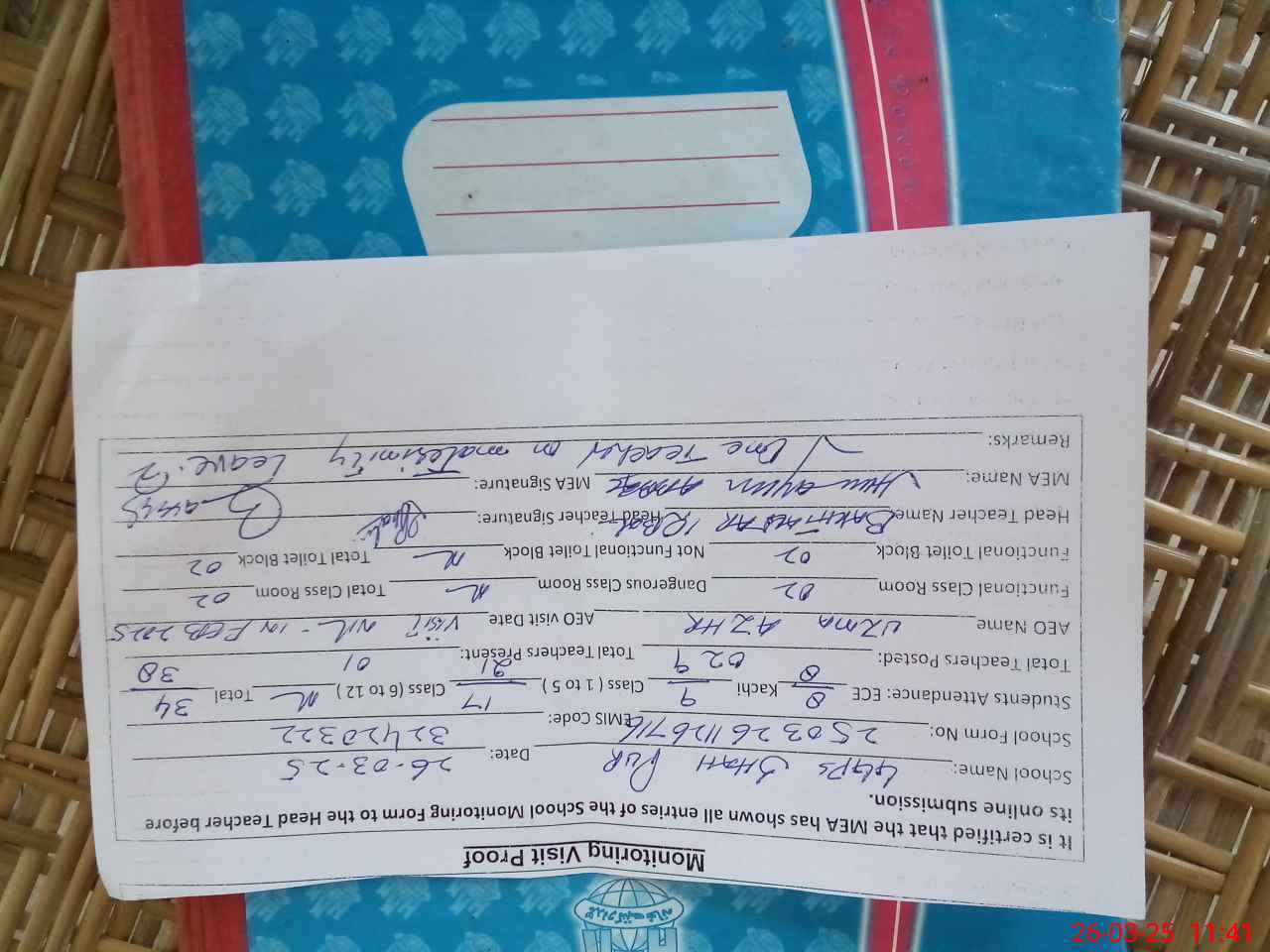 | Attendance Register | Head Teacher | MEA with School | Visit Proof |
