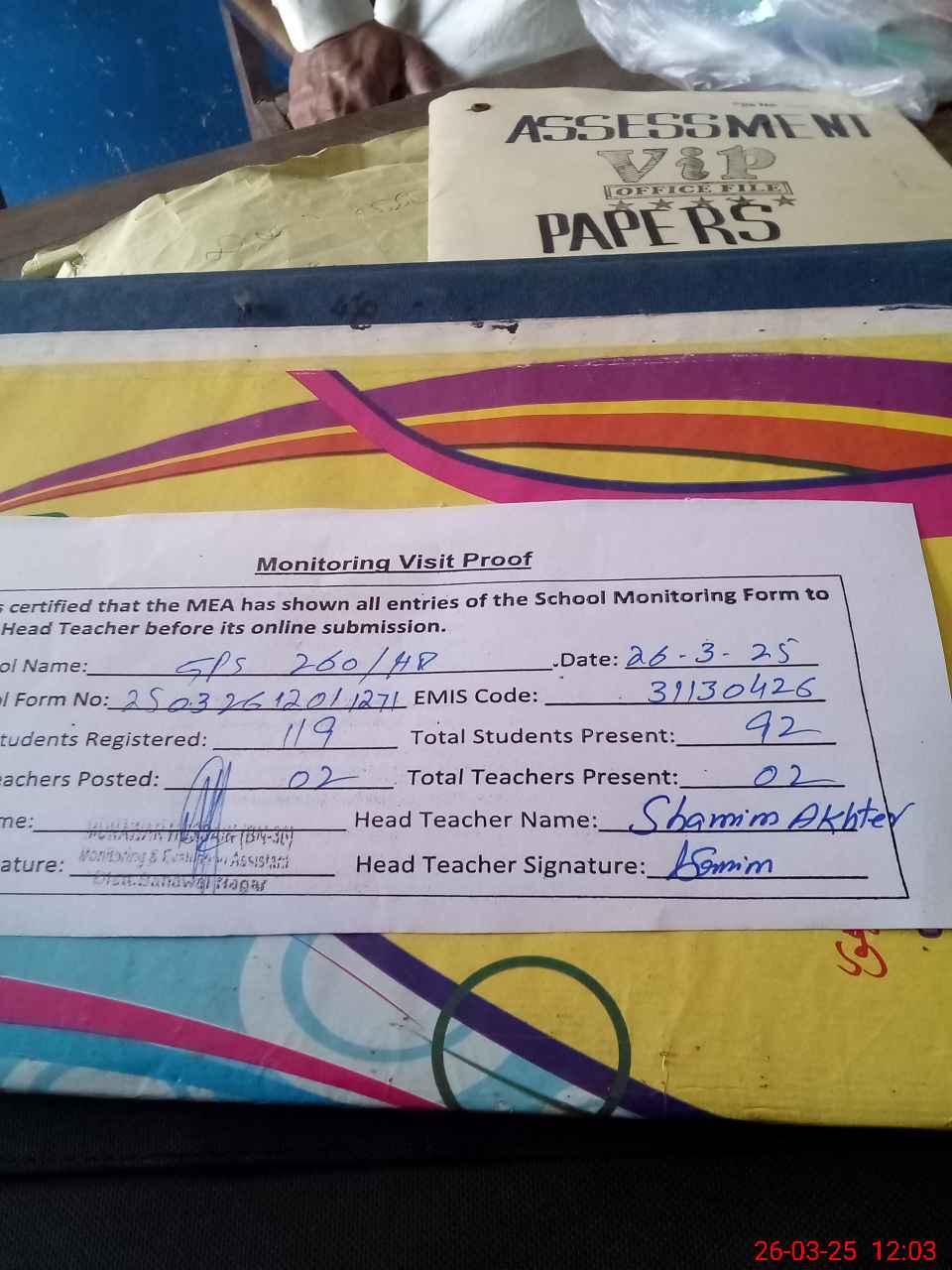 | Attendance Register | Head Teacher | MEA with School | Visit Proof |