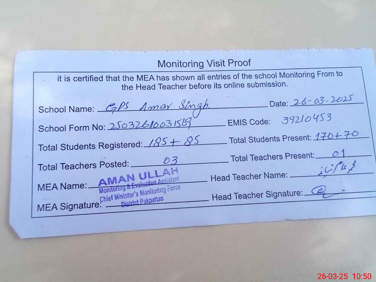 | Attendance Register | Head Teacher | MEA with School | Visit Proof |