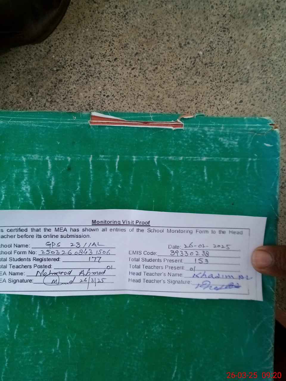 | EMIS Code: 39330238 | Name of School: GPS CHAK NO. 23/1-AL | |||