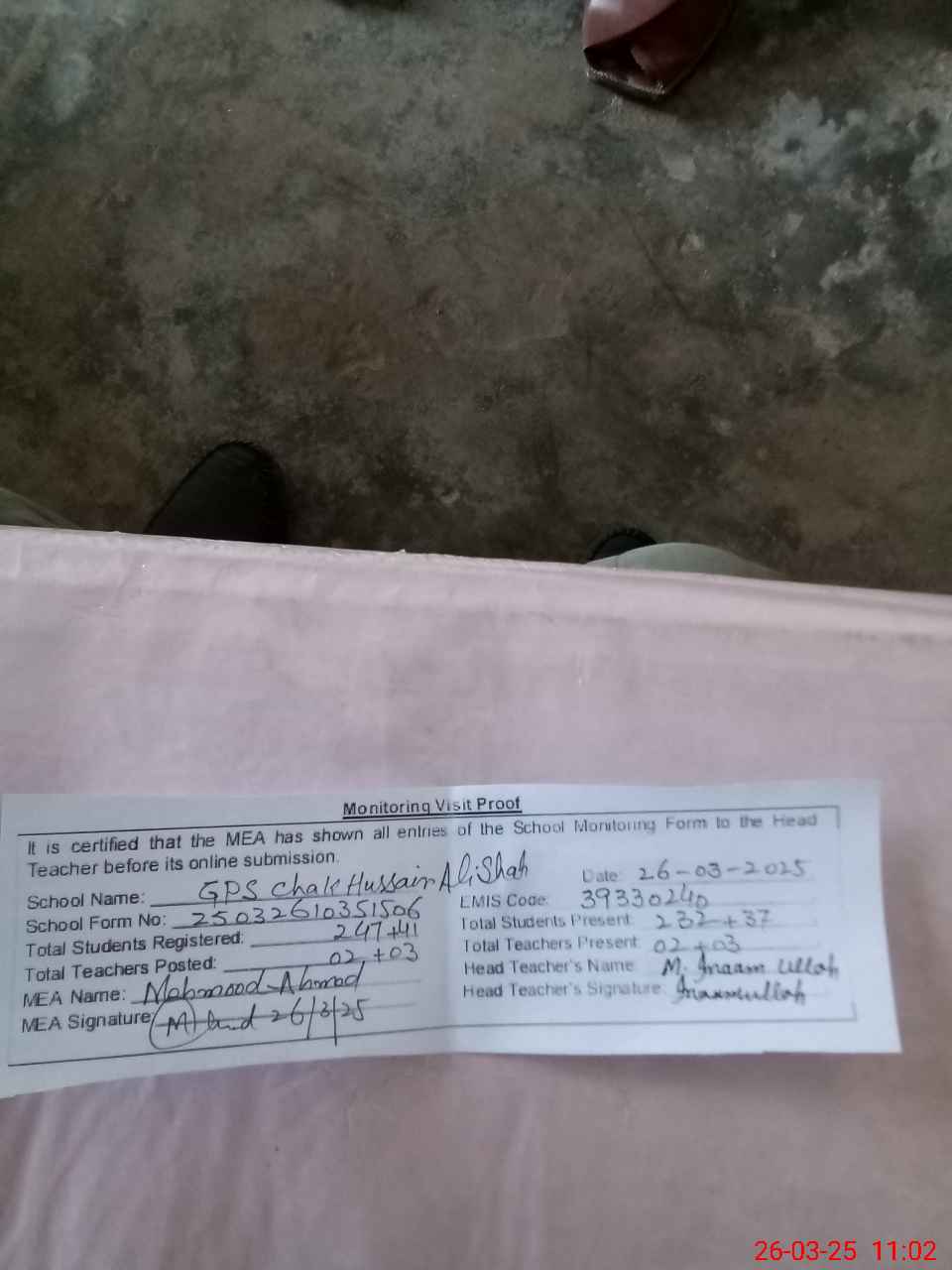 | Attendance Register | Head Teacher | MEA with School | Visit Proof |